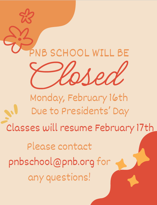 This is a reminder that PNB School is closed this Monday, February 16th in observation of Presidents’ Day, there are no classes at either location on Monday 2/16.