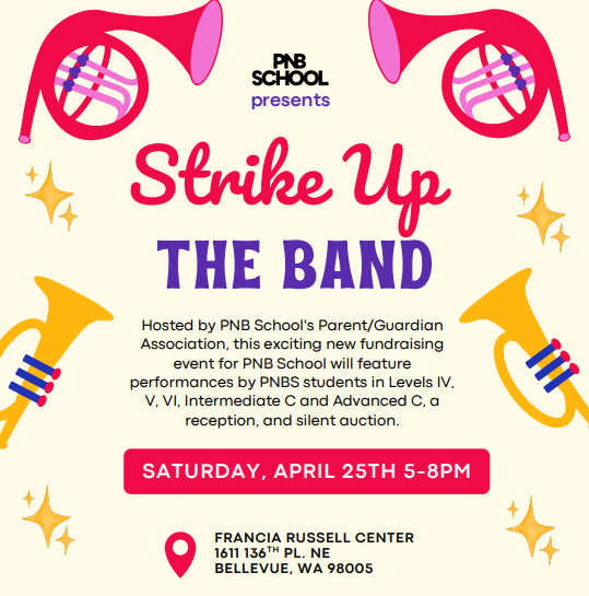 We are absolutely thrilled to invite the Level IV, V, VI, Intermediate C and Advanced C students to perform in PNB School’s Inaugural Fundraiser Strike Up the Band on Saturday, April 25th at the Francia Russell Center. This exciting night will feature a silent auction, original choreography for the classes to the rousing and inspiring music of John Philip Sousa, light appetizers, fellowship, and fun!