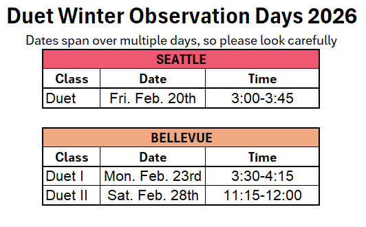 We are thrilled to invite you to observe your student’s class, please find the designated observation date and time for your dancer below!